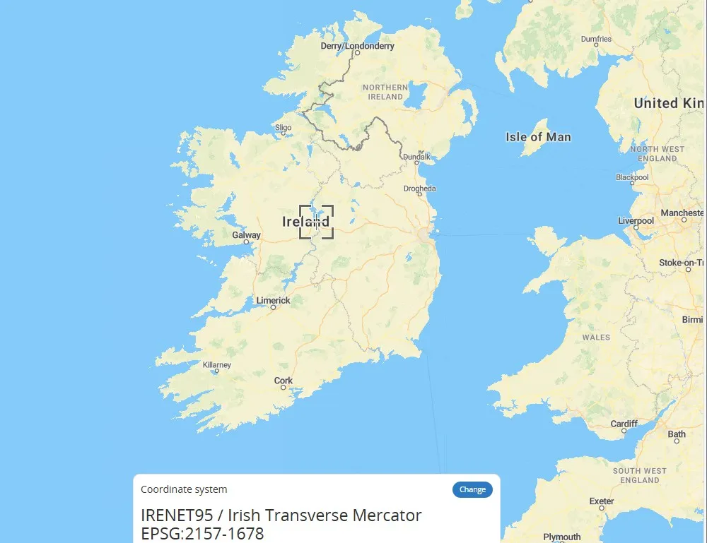 Irish Transverse Mercator (ITM) is a transverse Mercator projection coordinate system designed specifically for Ireland, using the ETRS89 ellipsoid as the reference. The central meridian of its projection is 8 degrees west longitude, and the geographic coordinates of the Irish region are converted into plane coordinates through the horizontal axis isometric cylindrical projection method to reduce deformation and meet national surveying and mapping needs. This coordinate system is the primary projection system for official maps and geospatial data of Ireland.
