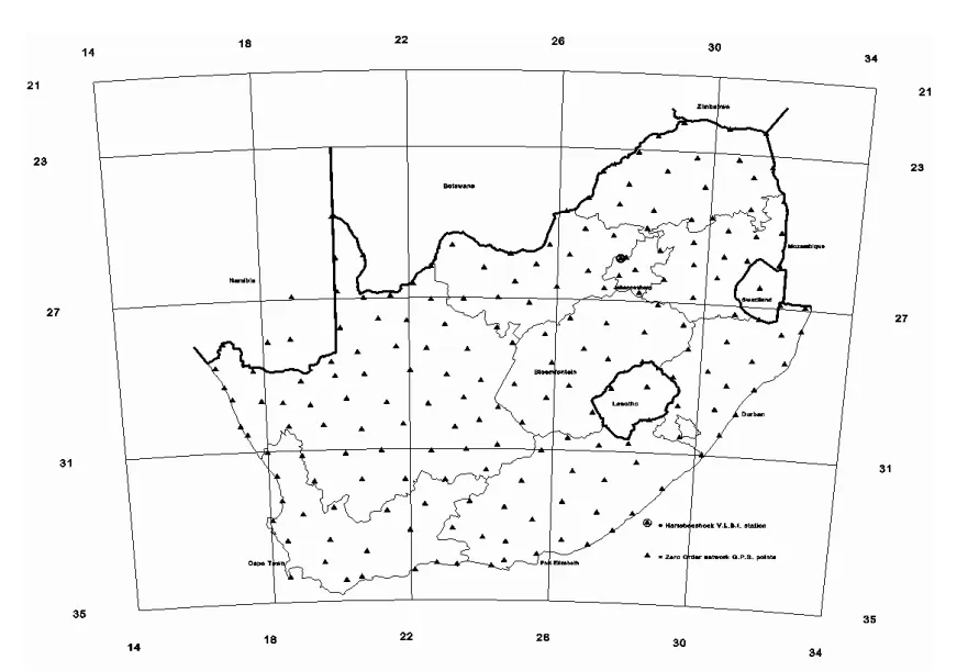 Hartebeesthoek94 (EPSG:4148) is a geographic coordinate system covering all of South Africa and has been adopted as the country's national geodetic standard. This coordinate system is based on the International Terrestrial Reference Frame (ITRF), which uses the Earth's center of gravity, and was introduced in 1994. Its primary purpose is to obtain and use accurate location information within South Africa for purposes such as mapping, surveying, infrastructure management, and disaster prevention. It is highly compatible with GNSS (particularly GPS) and provides positional accuracy that takes into account the effects of long-term crustal movement, making it also useful for geological surveys and wide-area surveys.