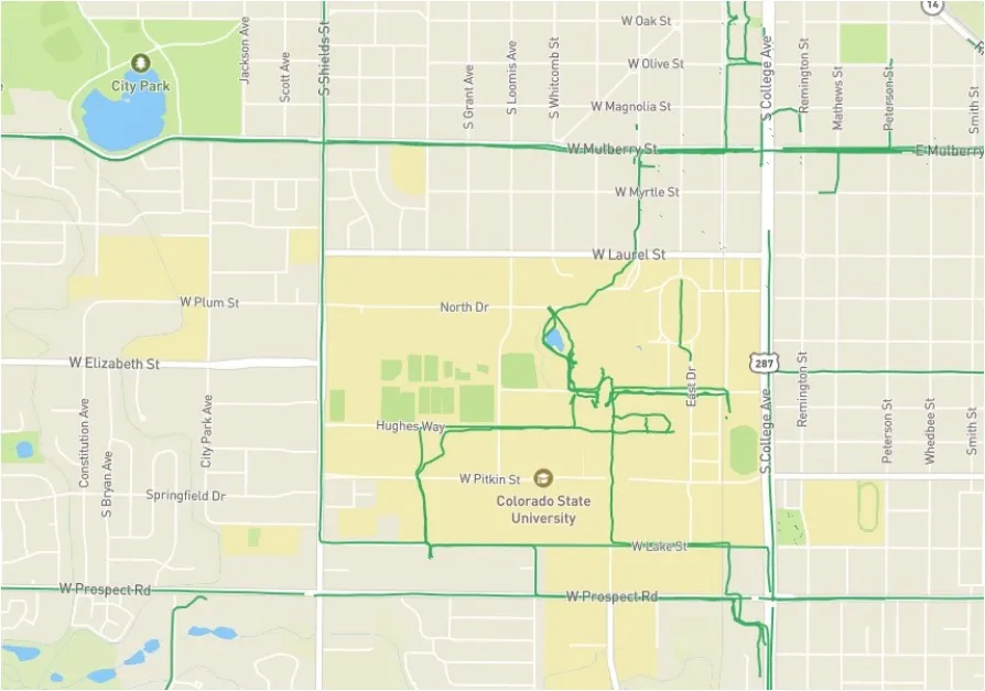 1. The green line across the Colorado State University campus indicates a linestring made up of a series of Mapillary photos.