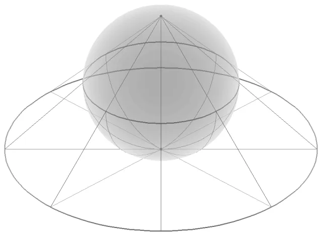 - A three-dimensional illustration of the projection of the sphere from the North Pole onto a plane beneath the sphere.