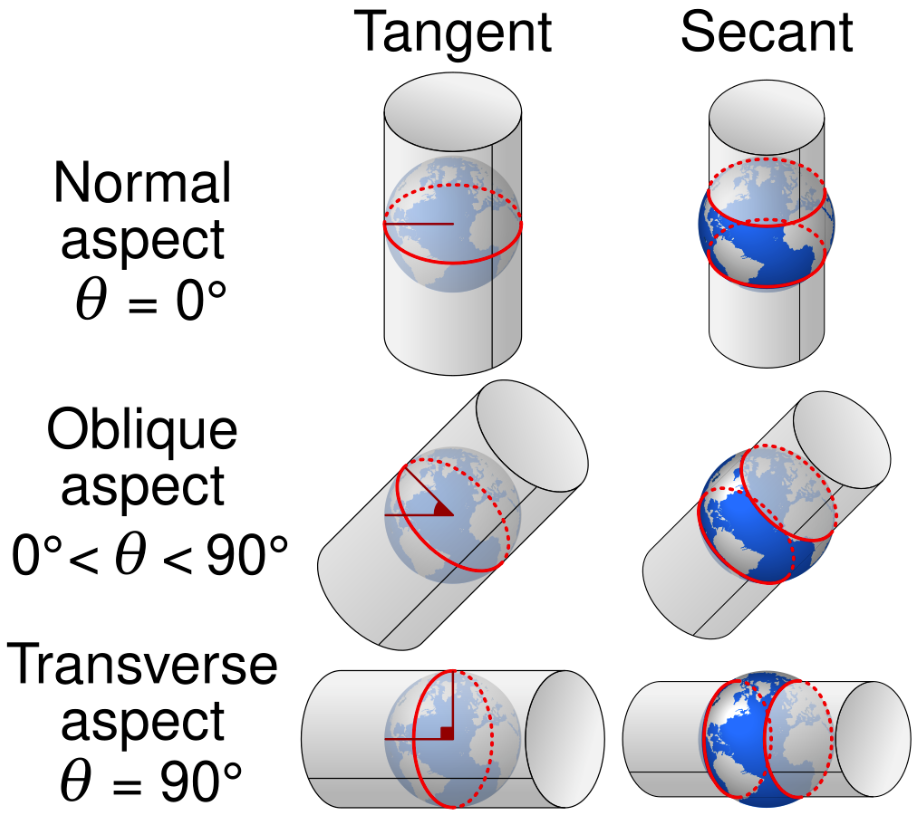 2. Comparison of tangent and secant forms of normal, oblique and transverse Mercator projections with standard parallels in red.