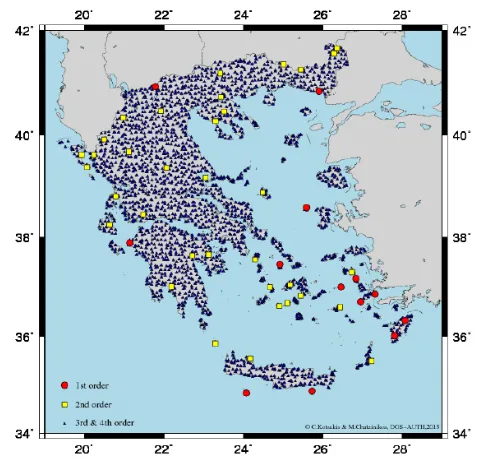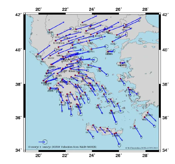 1. Estimated horizontal velocities for ITRF2008 at 105 permanent stations in Greece.