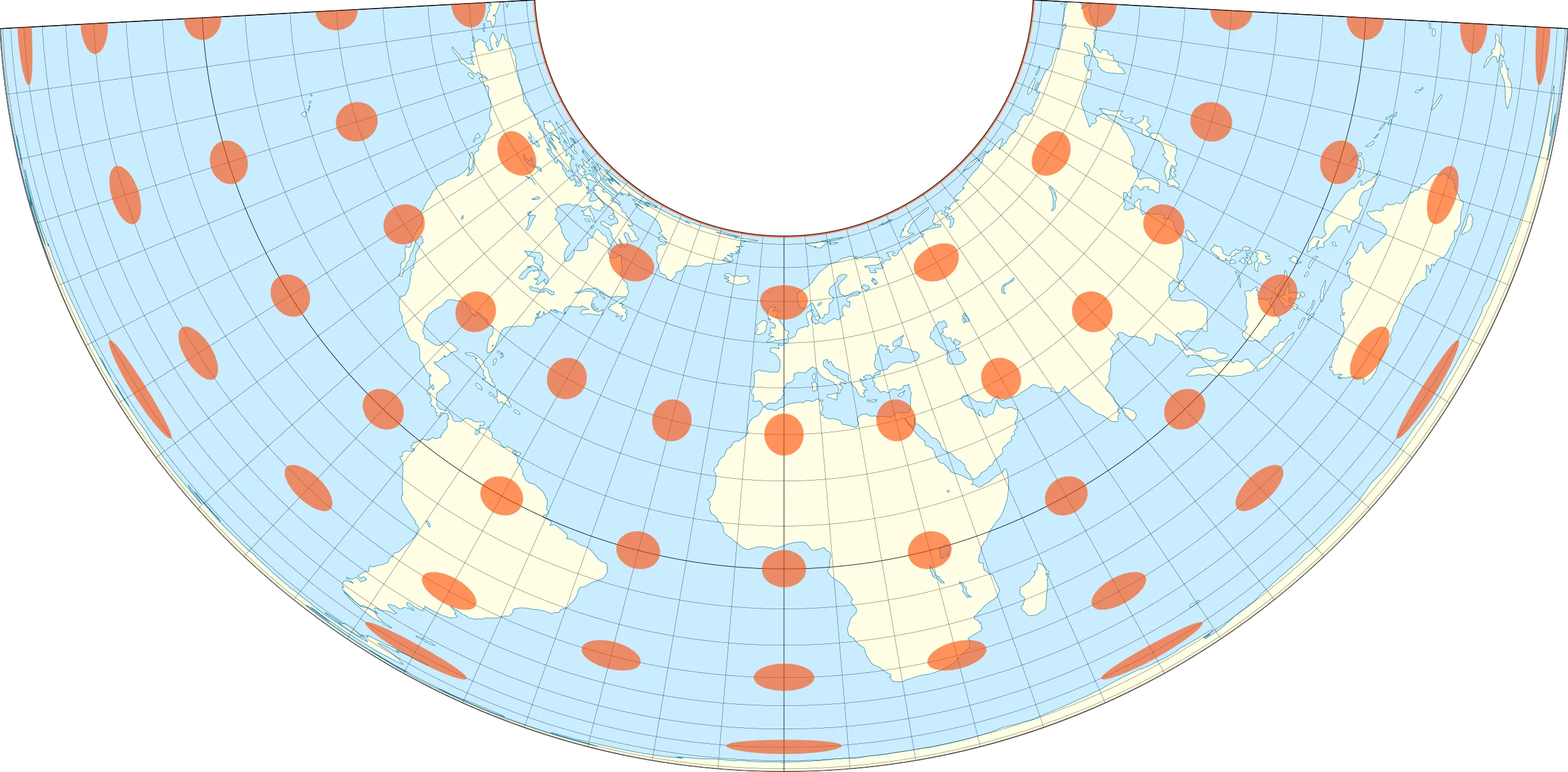 The projection is created by wrapping the Earth’s surface in a cone and unrolling it. It is based on two standard parallels (usually set in mid-latitudes) between which the shape of the area is minimally distorted while preserving the true area.