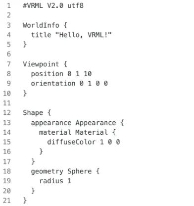 - File Header: As an extension of VRML, GeoVRML files typically begin with a VRML header format, such as #VRML V2.0 utf8, which identifies the file type and encoding. The header is a required component of a GeoVRML file, ensuring that browsers can correctly interpret the file contents.