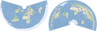 2. Shows an equidistant or simple conic projection with standard parallels located in the Northern (left) and Southern (right) Hemispheres.