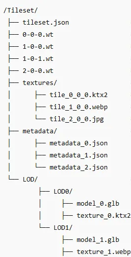 WT files divide geospatial data such as 3D models, textures, and metadata into tiles and manage them in a hierarchical structure. This allows large city or terrain models to be efficiently distributed in a streaming manner.