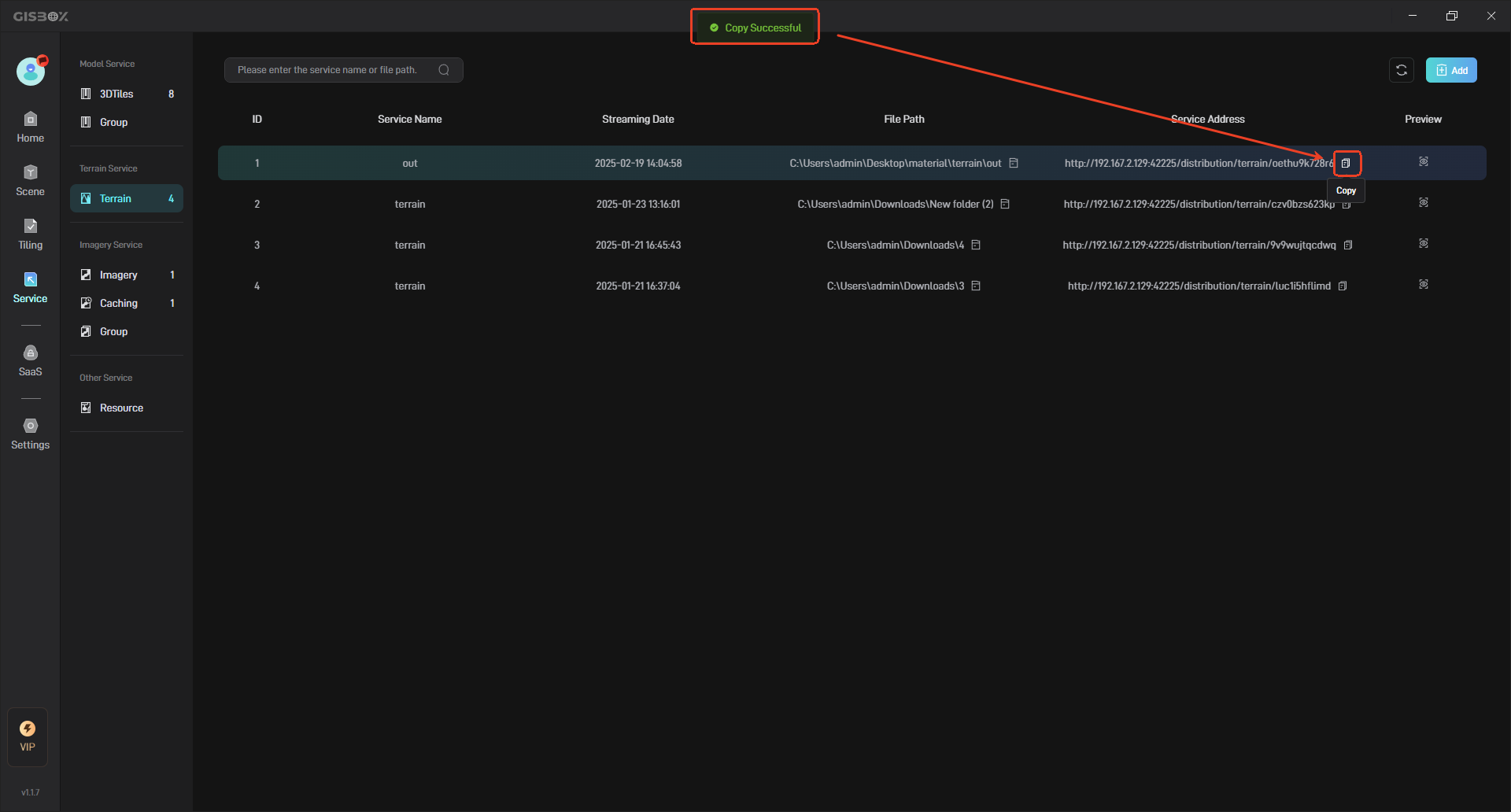After completing the tiling process, GISBox supports publishing the tiled data as services, which also entails distribution functionality. These services can include imagery services (such as WMS, WMTS), terrain services (like WMTS-Terrain), or 3D model services (e.g., 3D Tiles). The generated service addresses can be utilized in GIS engines like Cesium or Cesium for Unreal, and they can also be integrated into platforms for building digital twin projects.