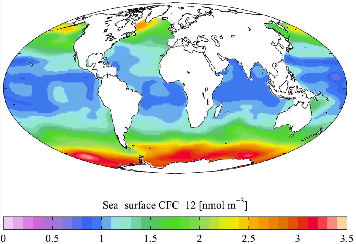 - 全球海洋データ分析プロジェクトによって測定された海面フレオン濃度。モルワイデ図法を用いて投影されています。