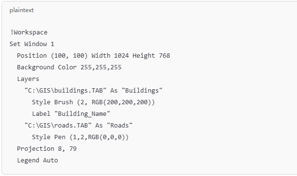 WOR ファイルは本質的にテキスト形式のファイルであり、通常のテキストエディタで開くことができます。その内容は MapBasic プログラミング言語に基づくコマンドの集合であり、プロジェクト内の地図データソース、レイヤーのプロパティ、マップウィンドウの表示方法などを記述しています。