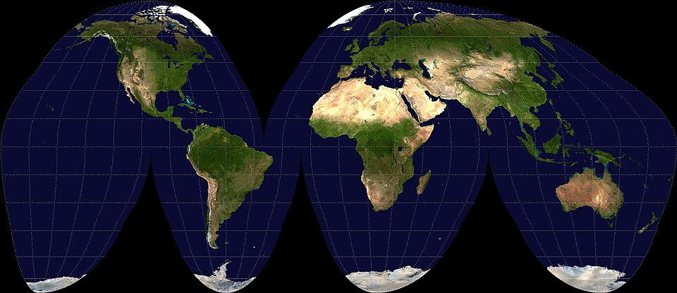 その最大の特徴は、「**分断型(Interrupted)」である点です。特に海洋部分において意図的に地図を分割し、陸地部分の形状や面積の歪みを最小限に抑えることを目的としています。そのため、地球全体を一目で見渡しながらも、面積の正確性と形状の保存性のバランスが高く評価されています。