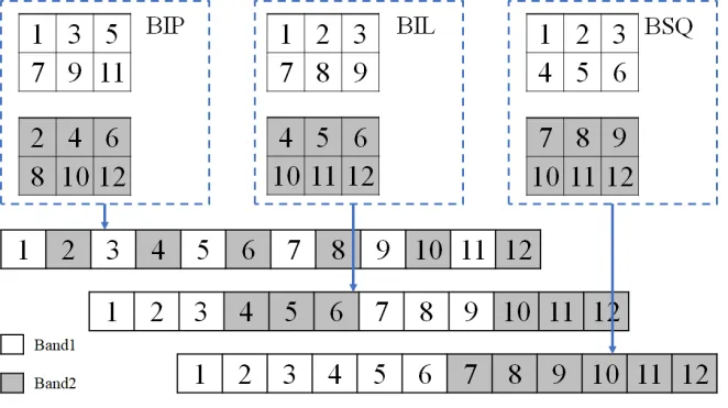 - BIP、BIL、BSQ の 3 形式におけるデータ保存方式の違い: