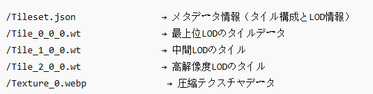 WT ファイルは、3D モデル、テクスチャ、メタデータなどを含む地理空間データをタイル形式で分割し、階層構造で管理します。